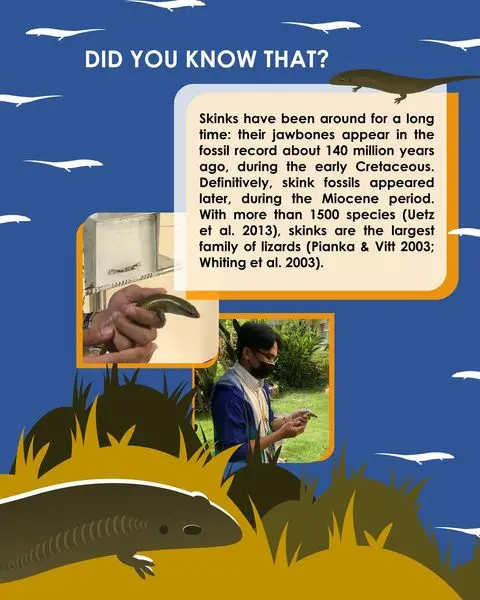 Did you know that skinks (or more commonly known as Bubuli in Tagalog) have been around for a long time? Their jawbones appear in the fossil record about 140 million years ago, during the early Cretaceous. Definitively, skink fossils appeared later, during the Miocene period. With more than 1500 species (Uetz et al. 2013), skinks are the largest family of lizards (Pianka & Vitt 2003; Whiting et al. 2003).